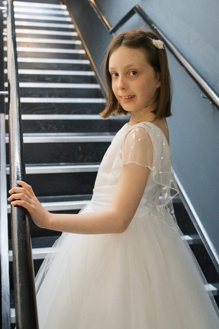 This cute Communion dress is a satin and tulle dream, with a full princess A-Line skirt perfect for twirling. The sleeves are delicate lace which flow around to the embroidered mini cape at the back.
